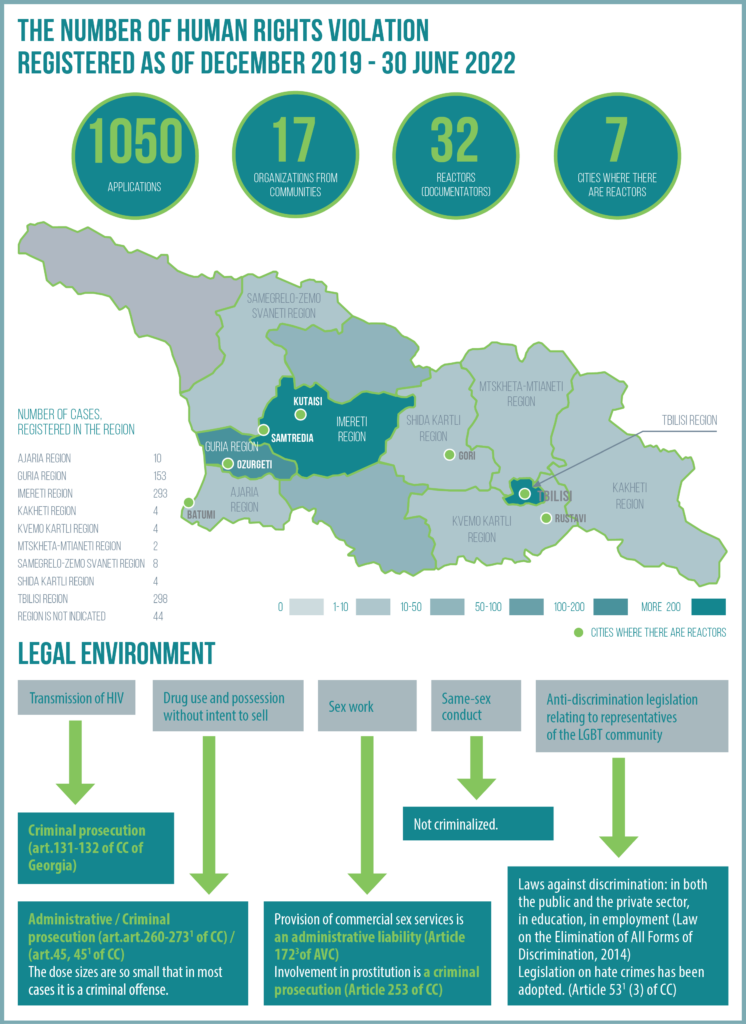 The REActor in Georgia is an outreach worker, case manager, social worker of an NGO providing services to key groups. Some REActors are lawyers or paralegals, cases that require more professional legal assistance may be referred to them. Information about incidents is communicated to the REActors directly by clients during the receipt of various services (testing for HIV, hepatitis C, hepatitis B, syphilis; syringe exchange; condom distribution; medical services; PrEP; legal services, etc.).
